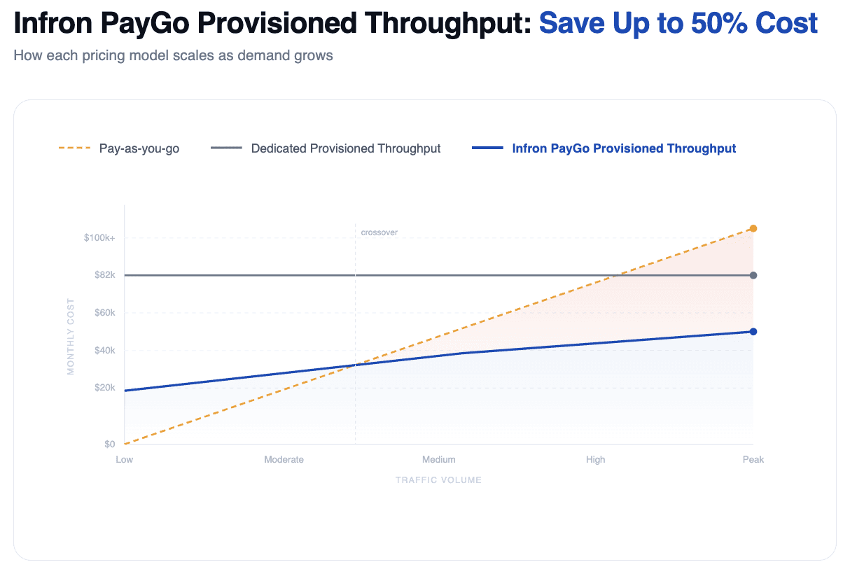 Using Infron's PayGo Provisioned Throughput: The system auto-scales to 3 units during peak hours and reduces to 1 unit overnight. The team pays only for what the workload actually demands: 3 units for 10 hours, 1 unit for 14 hours, across 30 days. Compared to Dedicated Provisioned Throughput, the expected savings range from 35% to 50%, while still benefiting from lower per-unit pricing than standard pay-as-you-go. No idle waste. No capacity ceiling. No forecasting required.